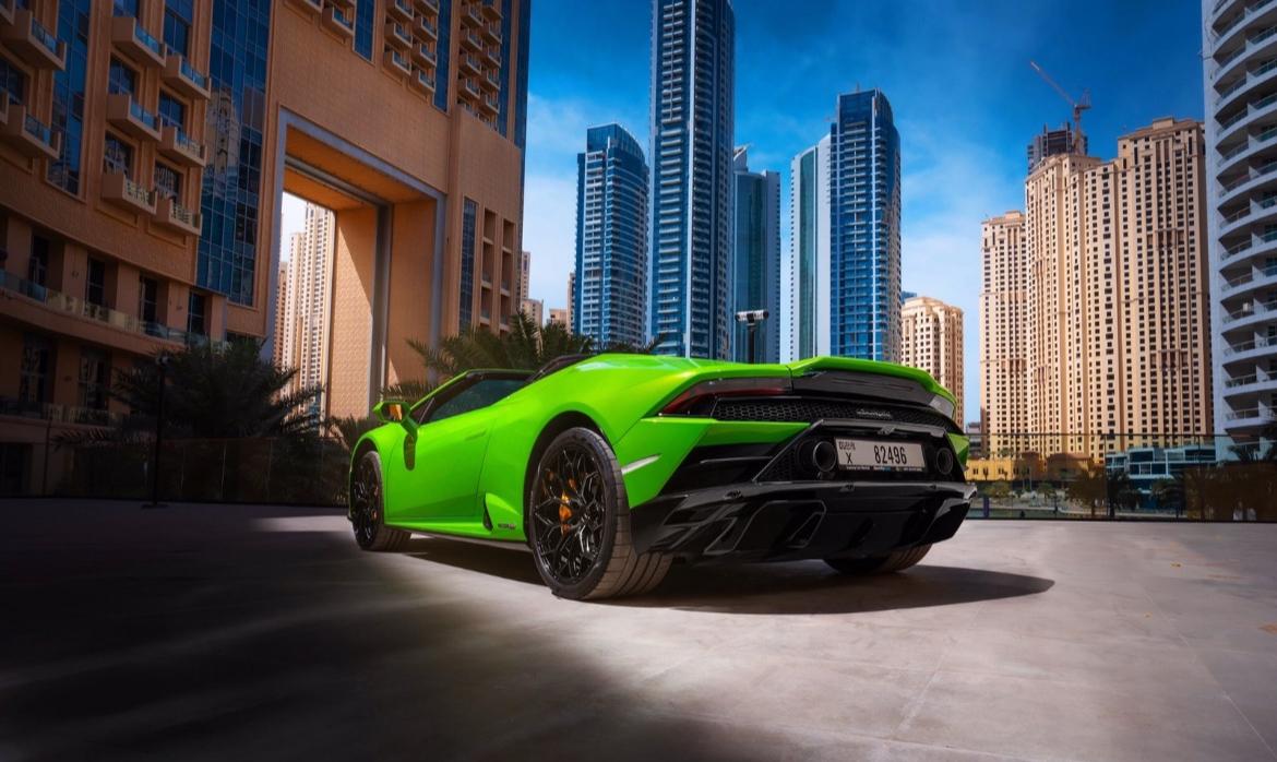 Louez et conduisez ce modèle Lamborghini Huracan Evo Spyder à Dubaï, pour 3 200 AED/jour et 65 000 AED/mois. Le coût de la location comprend l’assurance tous risques de base et la limite kilométrique standard de 250 km/jour (20 AED par km supplémentaire applicable). Un dépôt de garantie de 5 000 AED est demandé. Contactez Burnout Rent A Car directement pour les réservations et les demandes de renseignements.
